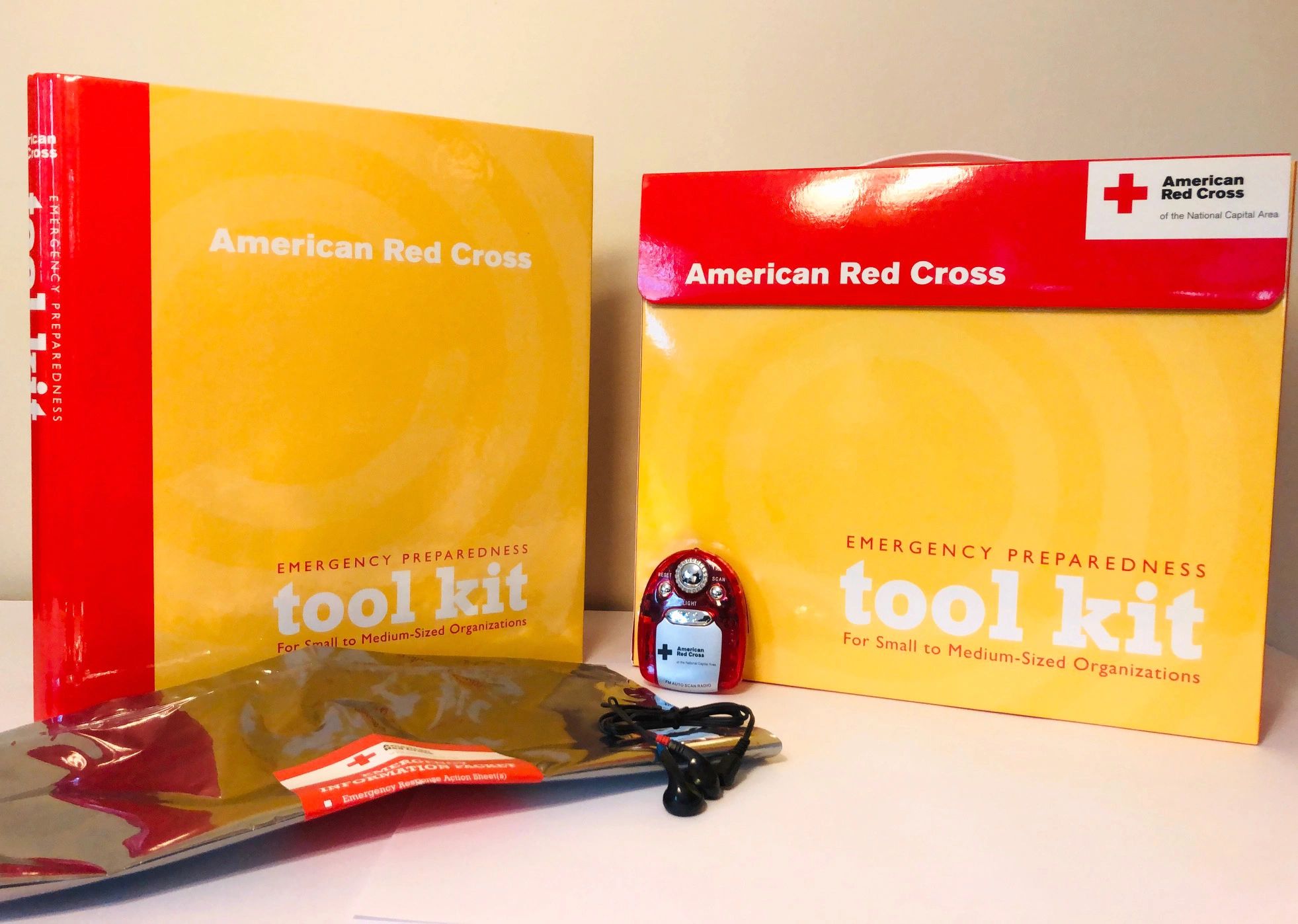 This tool kit was designed for the American Red Cross of the National Capital Area and is for Small to Medium sized organizations. The toolkit comes with a binder of simple guidelines, templates, and role assignments for individuals during a disaster. It also comes with a mylar bag, which should contain important legal documents and maps with escape routes. A small hand powered radio is also included so users can listen for emergency broadcasts. The radio also doubles as a flashlight. The entire kit is encased in the bright colored tool kit box, which should be easily identified during the event of an emergency.